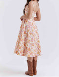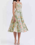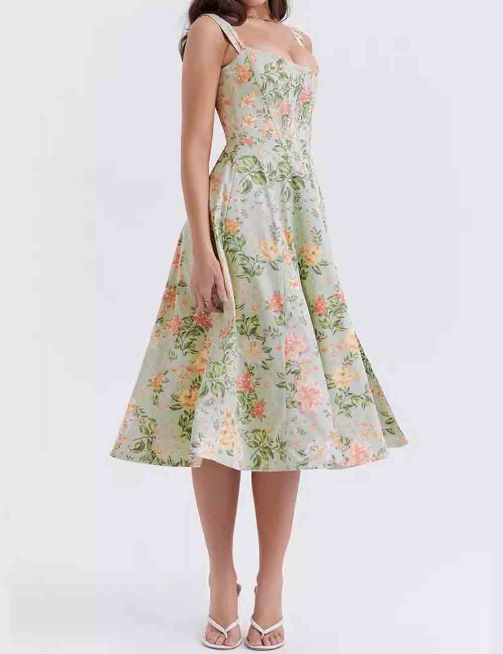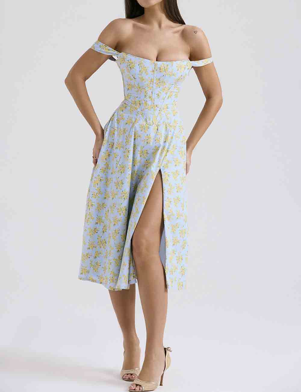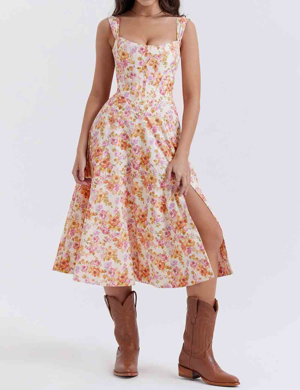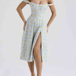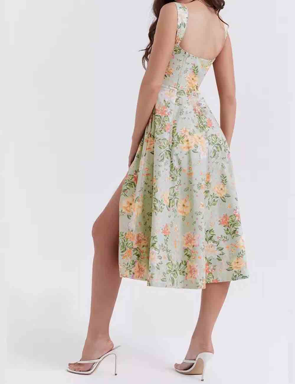 Ladies Floral Print Strape Shoulder Slit Midi Dress