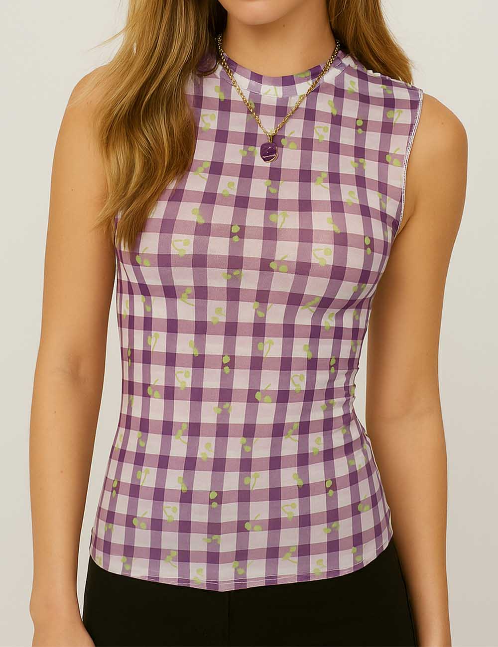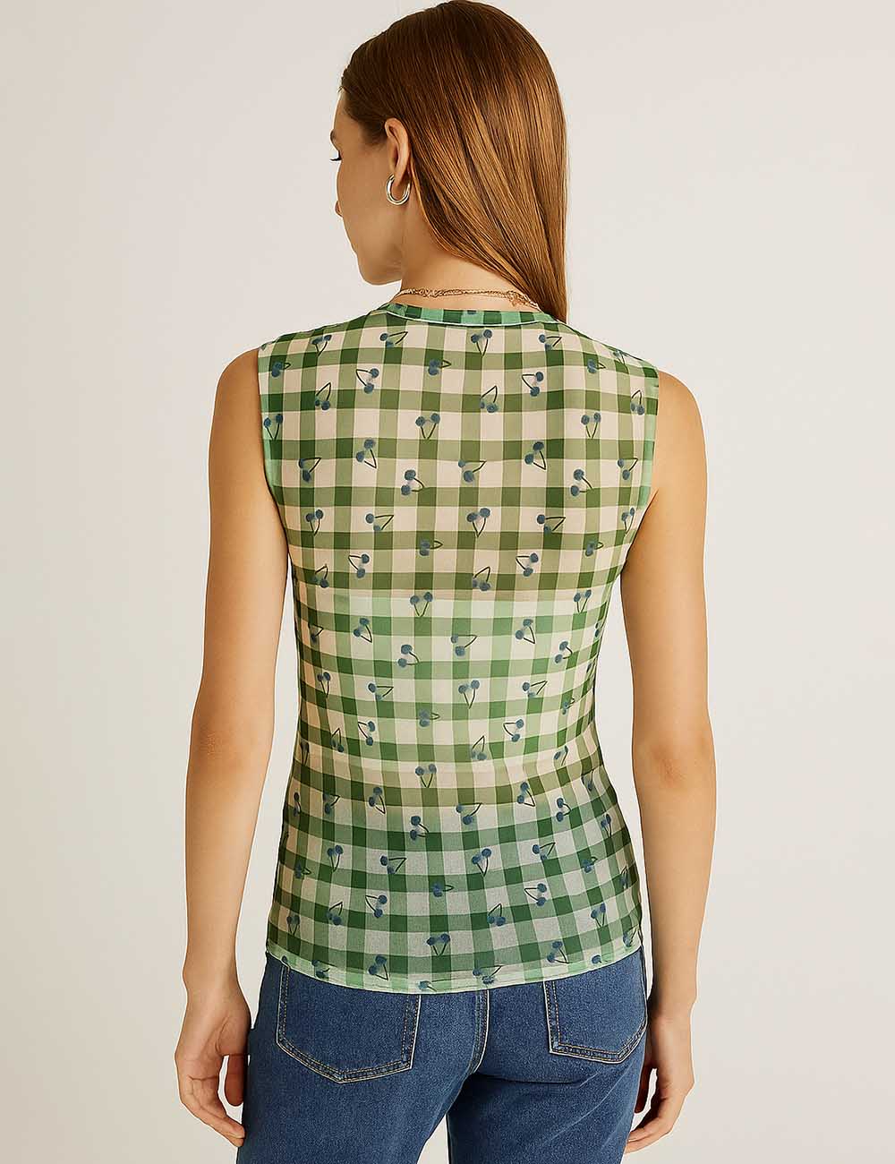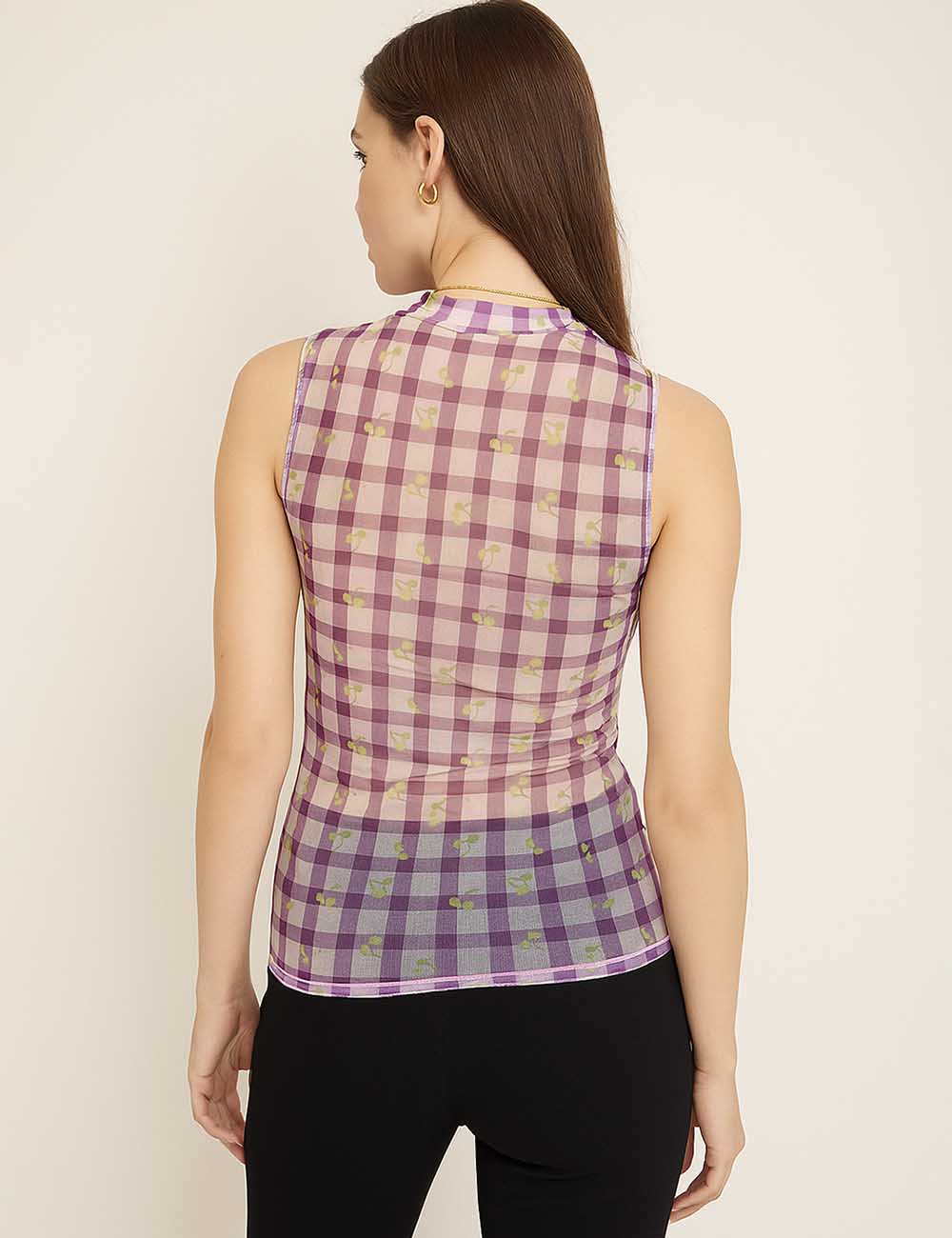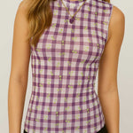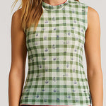 Women Sleeveless Mesh Tank Top Checked See Sheer Top